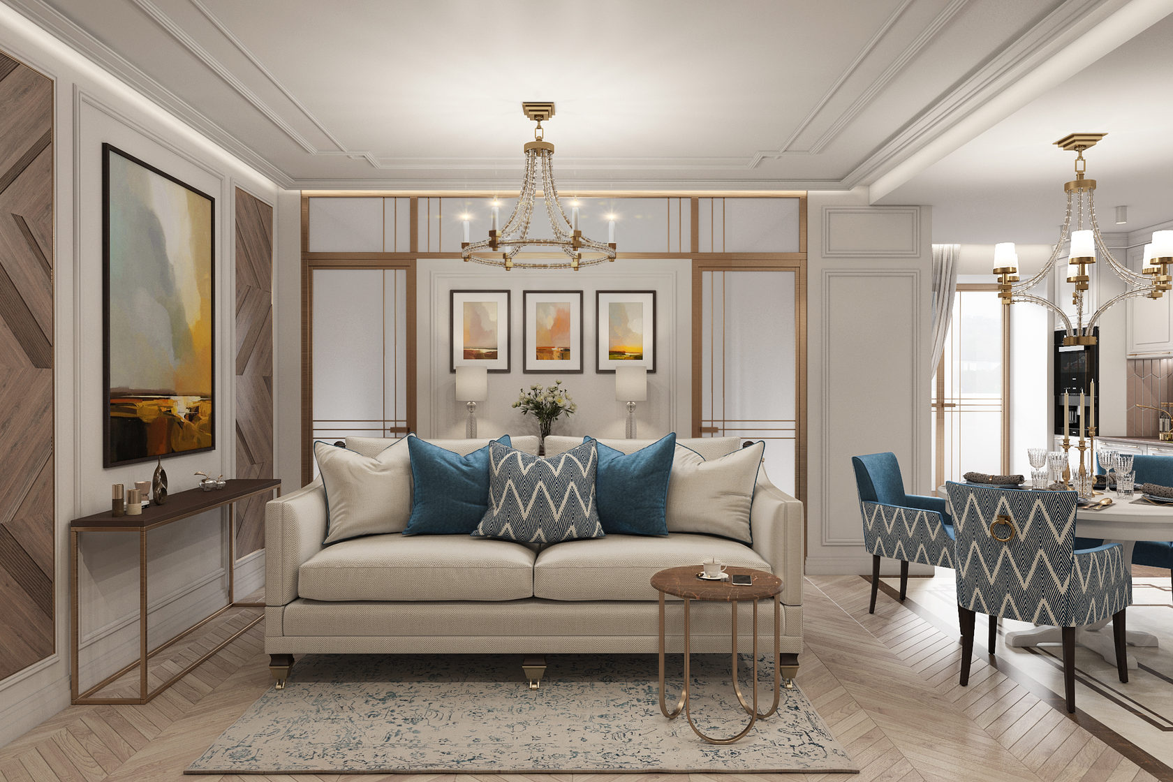 Проект для молодой семьи – родителей и маленькой дочери. Основной задачей проектирования являлось совмещение кухни, гостиной и обеденной зоны воедино, сохранив спальню родителей. Для зонирования пространства и сохранения естественного освещения в общей зоне было принято решение использовать легкие стеклянные конструкции с латунными вставками. Сердцем гостиной является камин из травертина, подчеркнутый панелями из наборного шпона натурального дерева. Общая стилистика интерьера – современная, легкая классика.