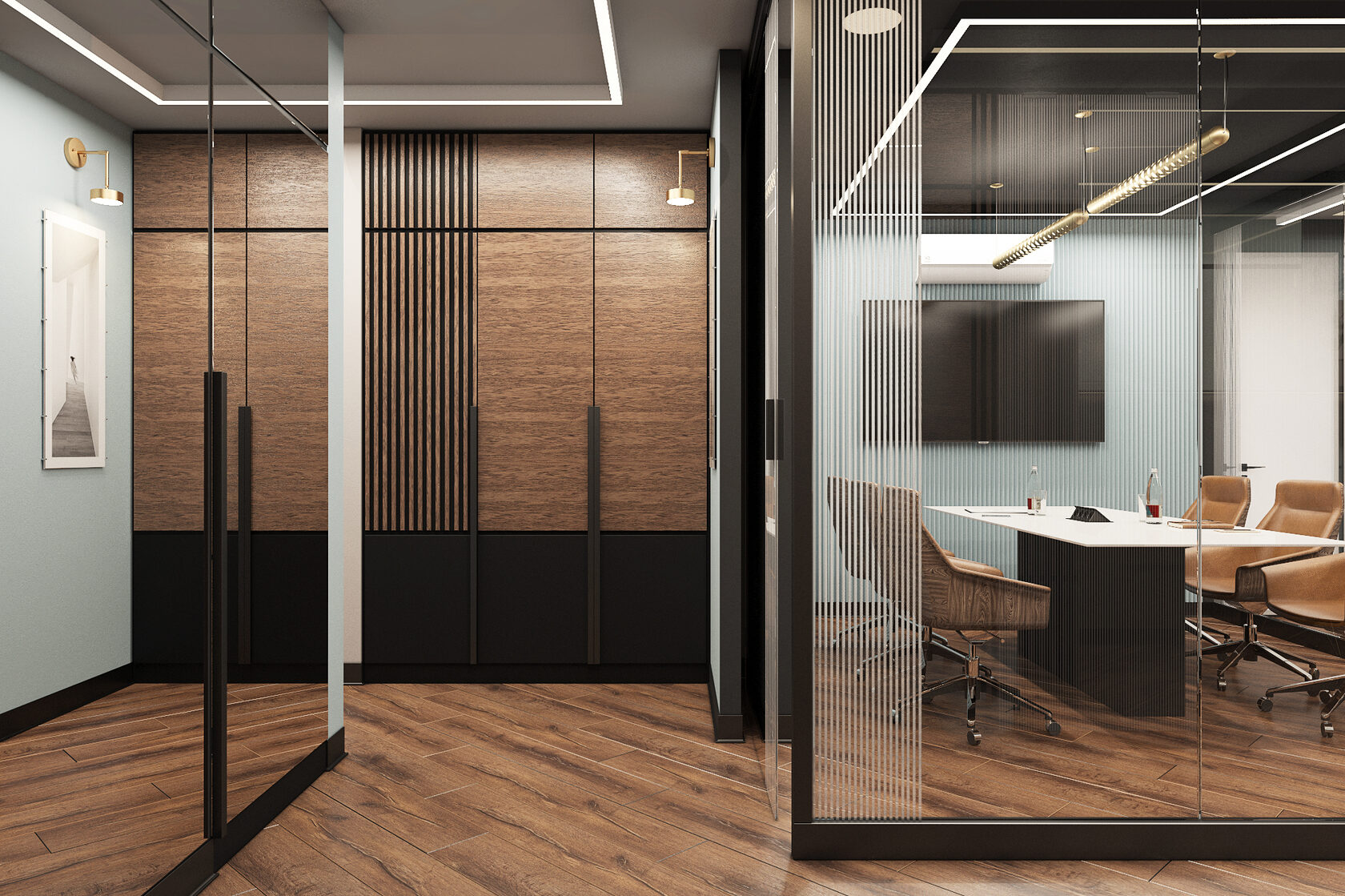 Офис для развивающейся компании. В отделке мы использовали небесный оттенок голубого, вельветовые панели, и конечно, шпон